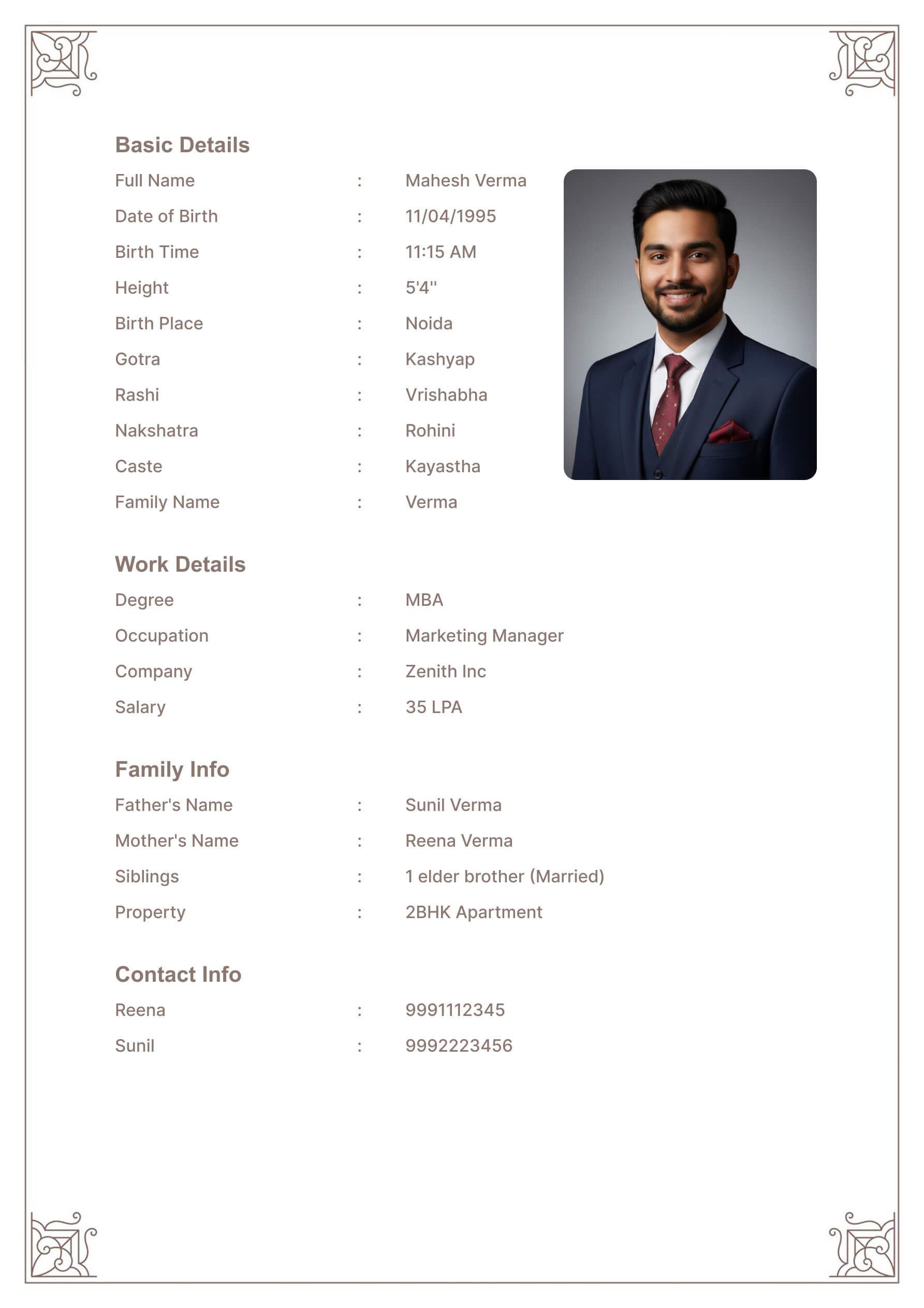 A polished biodata shows that you respect everyone’s time and emotions. Run through this checklist each time you update your profile, then export a fresh copy inside the MatrimonyBio editor. Whether you are emailing a community matchmaker or texting relatives abroad, an error-free, culturally aware biodata keeps the focus on compatibility—not on preventable mistakes.